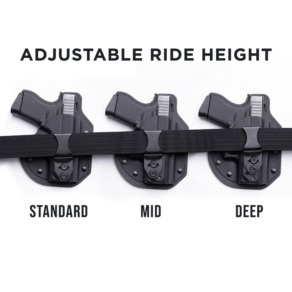 - Adjustable ride height feature allows for three adjustment levels allowing you to position your holster exactly where you want it!